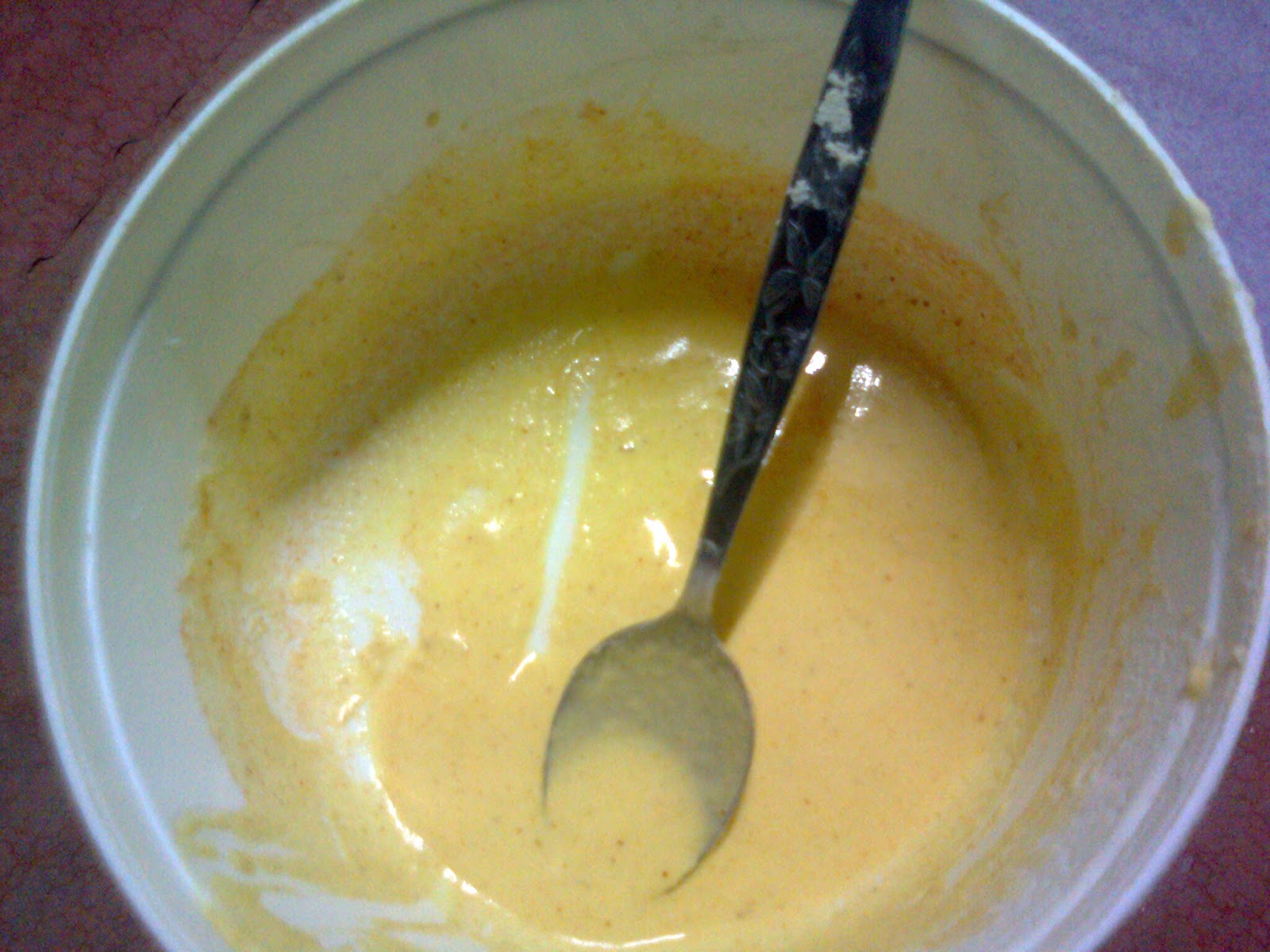 5. Selepas itu bancuh tepung. Bubuh la kunyit sikit dalam tepung tu kalau nak menguningkan tepung tadi.